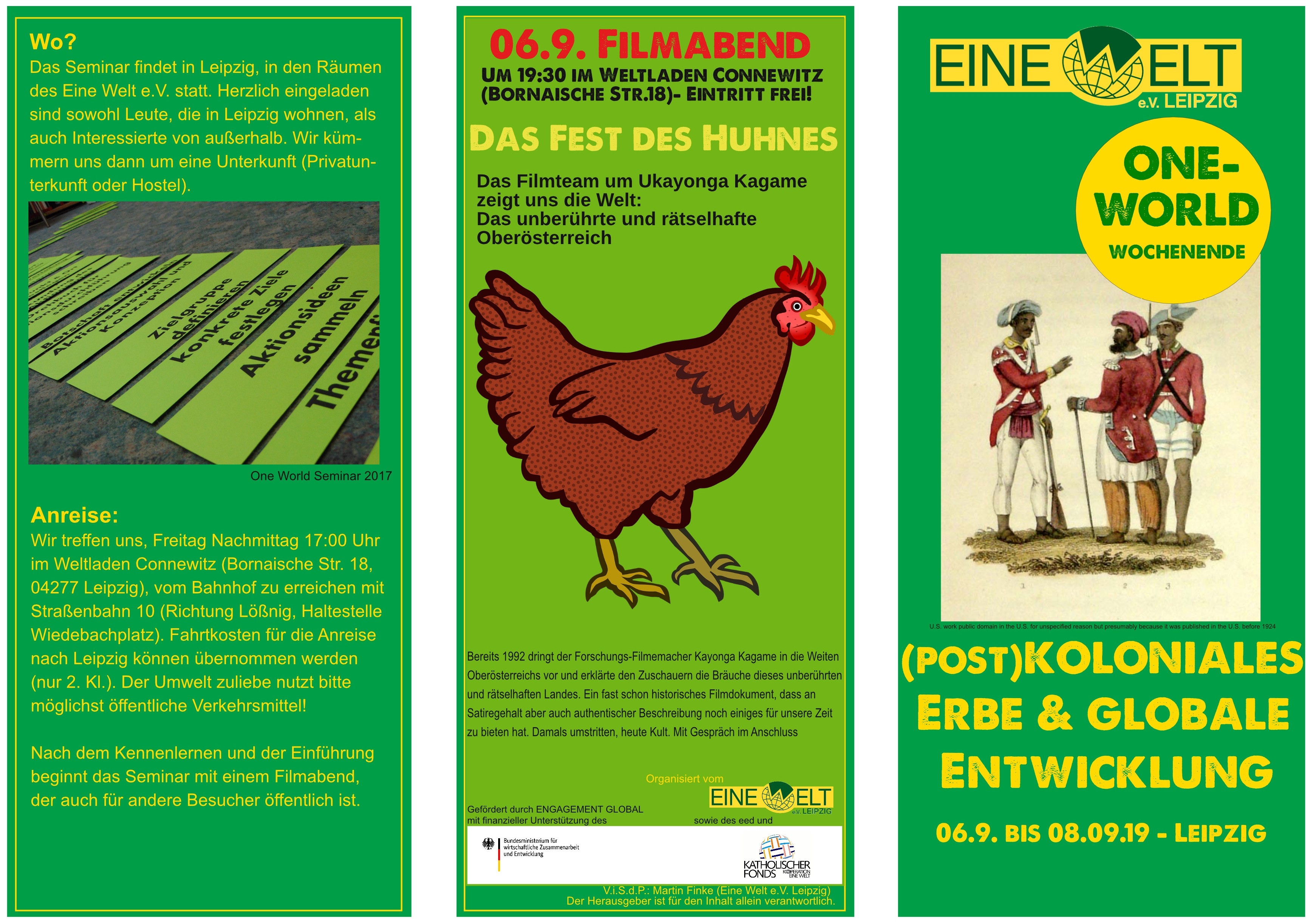 An diesem Wochenende wollen wir uns darüber mehr Klarheit verschaffen und uns auch damit beschäftigen, wie uns das im Alltag auch heute noch betrifft. Wir schauen uns einen fast schon historischen, anthropologischen Reise-Film nach Oberösterreich an, suchen bei einem Stadtrundgang nach dem kolonialen Erbe in Leipzig und wollen ergründen, was Schokolade eigentlich mit Elefanten und Kolonialismus zu tun hat. Hier im Flyer weitere Infos: