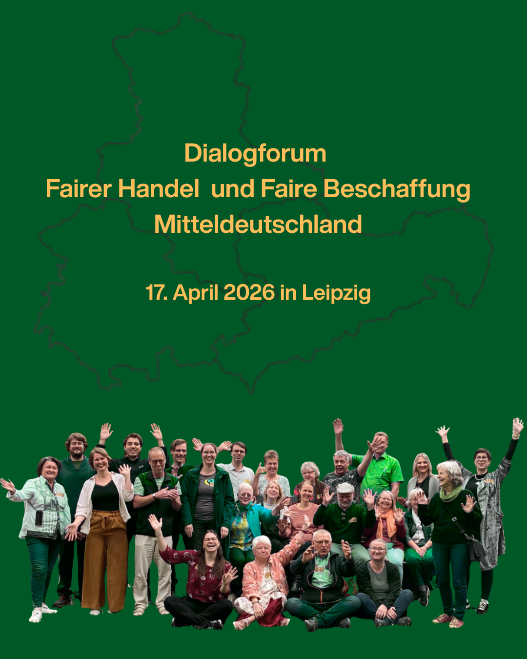 Einladung zum Dialogforum Mitteldeutschland Fairer Handel und Faire Beschaffung _________________________________________ Wo: Leipzig | Wann: Freitag, 17. April | 10:30 -18:00 Uhr Wir laden Sie und euch herzlich zum Dialogforum Mitteldeutschland nach Leipzig ein! Gemeinsam möchten wir uns zum Fairem Handel und zur Fairer Beschaffung austauschen, voneinander lernen und neue Impulse für unsere Kommunen mitnehmen. Warum […]