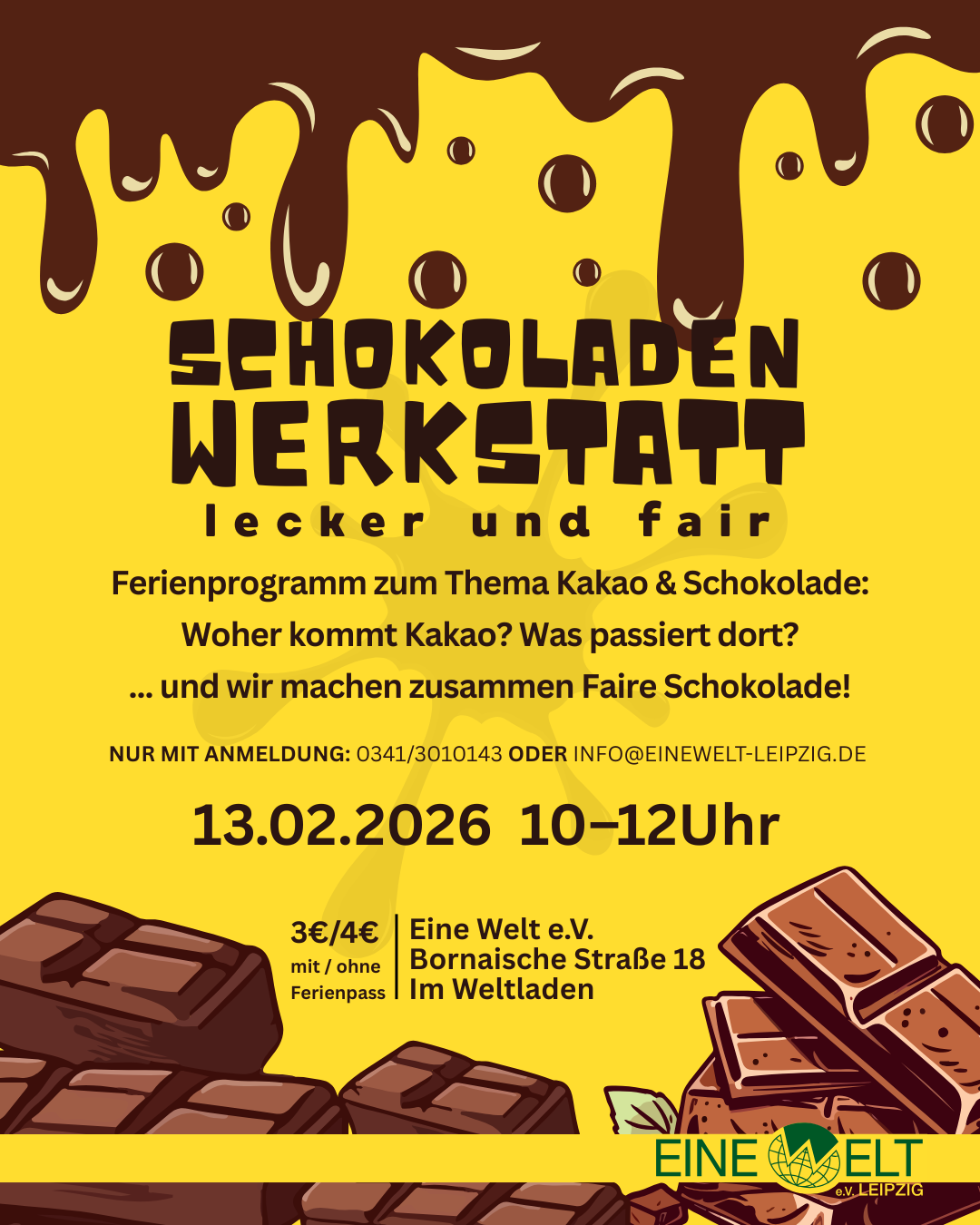 Mit Bildern, viel zum Verkosten und einigem mehr erfahrt Ihr alles zum Anbau von Kakao, der Lebenssituation der Kakaobauern und-bäuerinnen sowie deren Kinder! Auch erfahrt Ihr wie daraus Schokolade wird und könnt bei uns Eure eigene Schokolade herstellen und direkt vernaschen. Alles lecker und fair! Hinweis bevor Missverständnisse entstehen: Wir machen NICHT NUR Schokolade, der […]