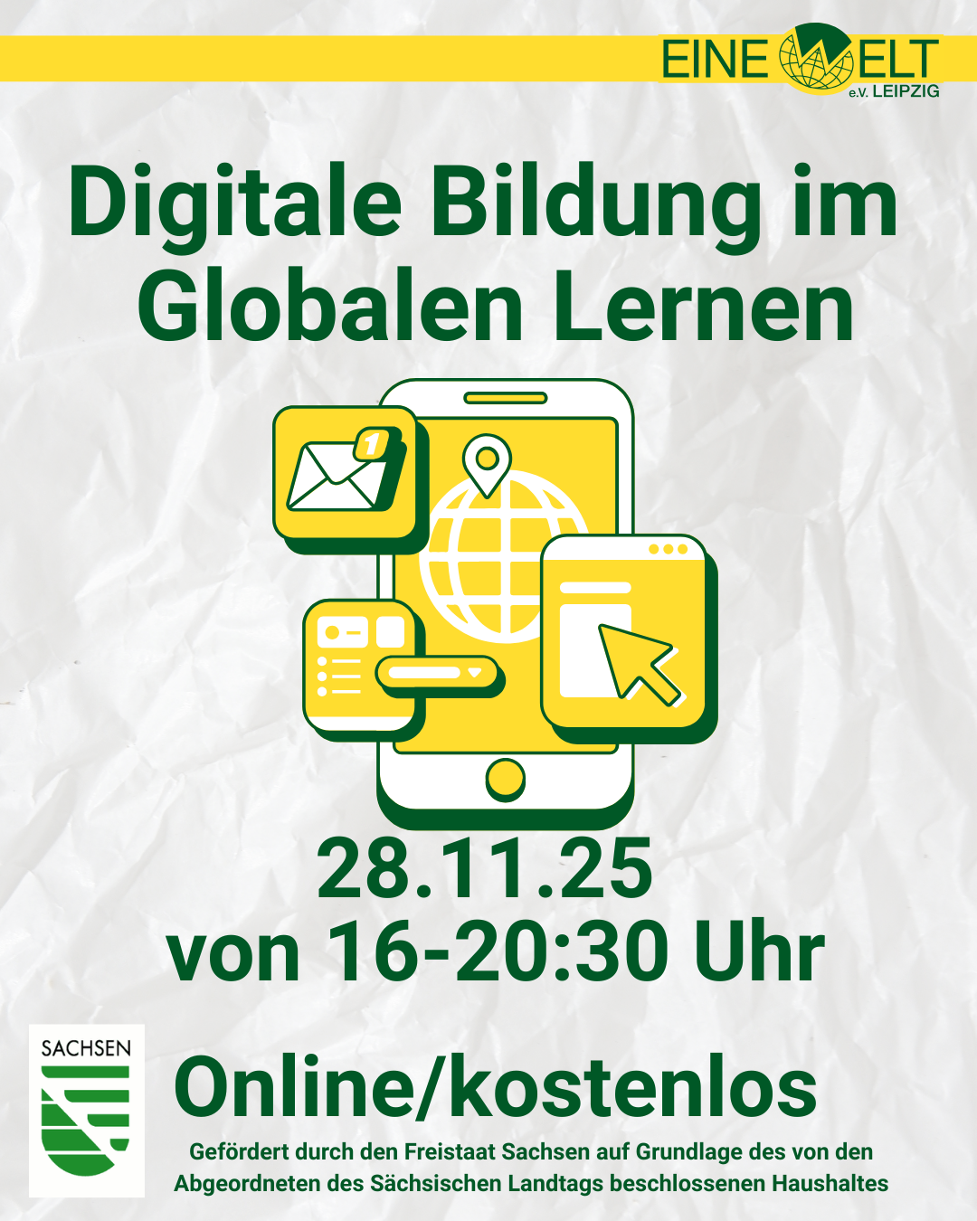 Einladung zum Workshop„Digitale Bildung im globalen Lernen“ Die Veranstaltung finden Online statt am 28.11.25 von 16:00 bis 20:30 Uhr Die digitale Transformation eröffnet neue Möglichkeiten für Bildung – auch im globalen Lernen. Doch wie können digitale Werkzeuge sinnvoll eingesetzt werden, um globale Zusammenhänge verständlich, kritisch und partizipativ zu vermitteln? In unserem Workshop „Digitale Bildung im […]